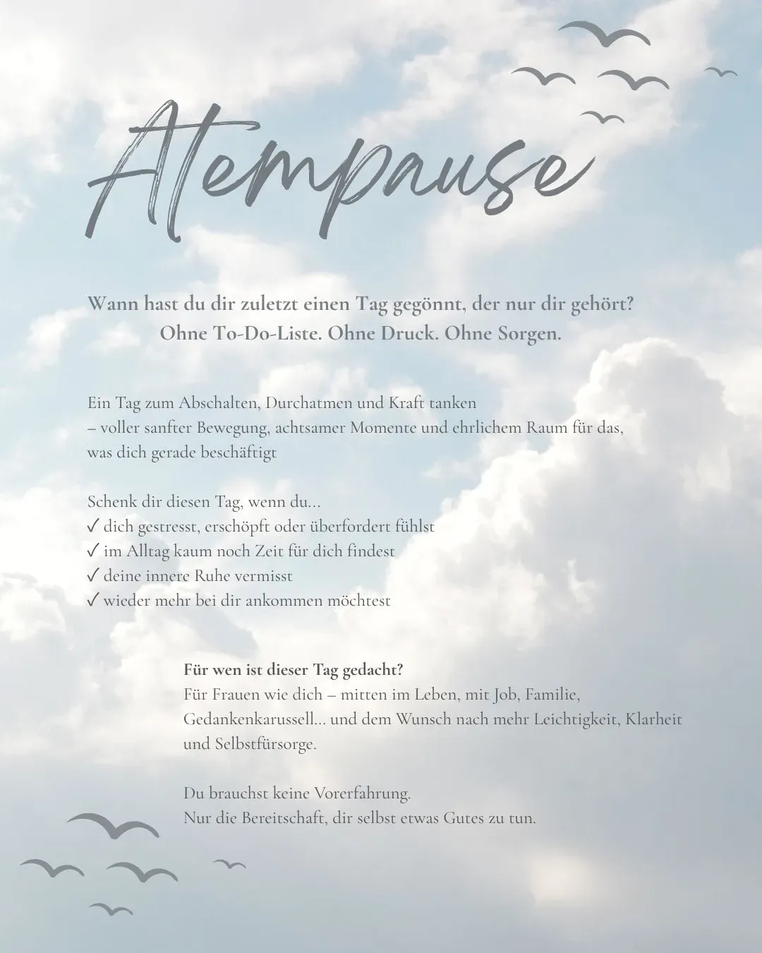 Atempause ist mehr als ein Seminar – es ist unsere erstes gemeinsames Projekt mit meiner Tochter. Mit viel Freude und der Vielfalt,die aus unseren unterschiedliche Ansätzen und Ausbildungen entsteht, laden wir euch ein zu einem Tag, der ganz euch gehört. Ein Tag zum Durchatmen, Auftanken einfach Sein – ohne To-do-Liste, ohne Druck, dafür mit Raum für das, was euch bewegt.